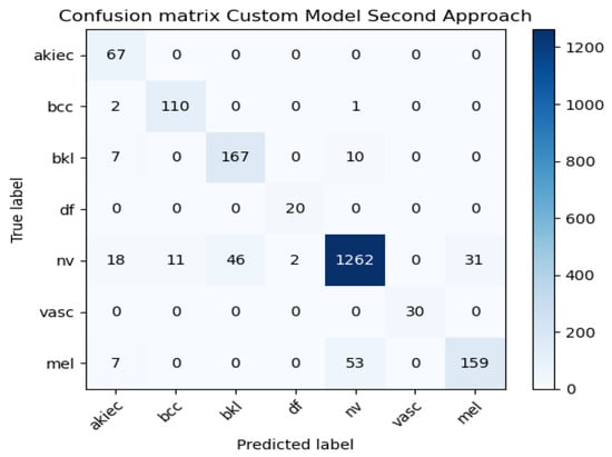 In order to avoid bias in the classification accuracy of the developed DL model, balance and imbalance among classes should be considered. When there is a skewed distribution of classes in the dataset, relying solely on overall balanced accuracy can lead to misleading results. To address this, we evaluated the developed CNN over the same dataset twice, including the imbalanced and balanced data (shown in Figure 6 and Figure 8). The training and test results after eight iterations of training. There is a tendency for validation accuracy to be higher during the initial iterations compared to training accuracy. As the epochs progress, test and validation accuracies are likely to become more similar. The correlation between the training and test reached approximately 70%. A balanced HAM10000 dataset with 46,935 images was initially validated with a 50% degree of accuracy (Figure 7 and Figure 11). A 0.2 loss was recorded after the sixth epoch, and the percentage reached 90% for both the test and validation sets (Figure 9). A number of additional metrics have been generated after training the model has been completed, which can be viewed in Table 5 and Figure 12. The first model has a 100% specificity (true positive rate) and a 38.2% sensitivity (true negative rate), indicating that it can primarily predict instances of the majority class (i.e., NV and BKL cases), but not accurately identify instances of the minority class. As the second approach training process does not involve class imbalance, an F1 score of 90 indicates an acceptable model performance.