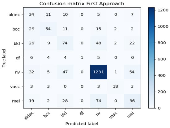 The proposed HHOForSkin was evaluated based on multiple criteria including accuracy, F1 score, sensitivity, and specificity. An accurate classification in a seven-class classification problem represents the proportion of samples correctly classified out of the total number of samples across all classes (Equations (7)–(10)). In each class, the true positive (TP) value indicates how many samples have been correctly classified as belonging to that class. A true negative (TN) value represents the number of samples correctly identified as not belonging to a specific category. A confusion matrix (CM) is employed in order to evaluate HHOForSkin’s performance. During the execution of the method, these matrices will provide insights into the characteristics of the classification performance.