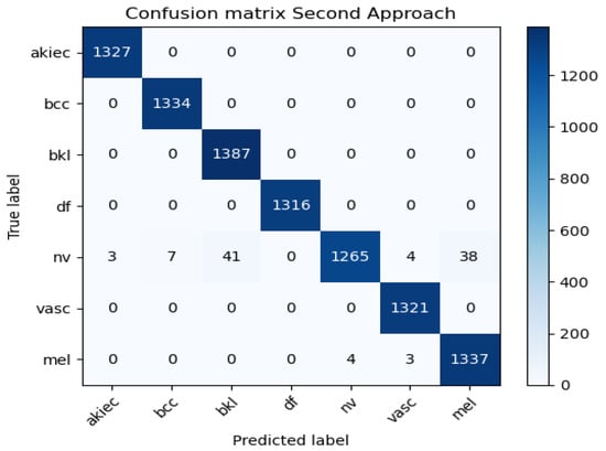 The data balancing was carried out based on the principle of equalizing the number of samples in the least represented class with the number of samples in the most represented class within the dataset using the RandomOverSampler technique. RandomOverSampler is a machine learning technique that is employed to address class imbalance in data [49]. It involves selecting and duplicating multiple instances from the minority class randomly and adding them to the dataset several times, potentially resulting in the two classes being equally represented [49]. After the dataset had been balanced, 6705 images were created for each of the seven types of skin cancer.