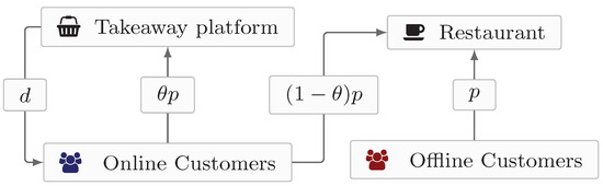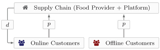 In this model, we assume that there is only one platform and one food service provider in the market. The food service provider operates offline sales, while online takeaways are sold through the platform. In this section, we assume that the food service provider relies on the platform to help promote its products. The promotion affects the number of people who dine offline and order takeaway online. The offline sales price is p. The online sales price is the same as the offline sales price. (See Figure 1). Usually, the platform will either provide a discount or charge a surcharge for the online sales to differentiate pricing from the offline sales, which we assume to be d. Note that d can be negative, indicating that the platform will then choose to charge a surcharge instead of providing a discount, so the actual online sales price for customers is . The platform takes a percentage of revenue from online sales as a revenue share, which is . The platform will promote the products with a promotional effort of , which is determined by the platform, and we assume that the cost is . The magnitude of the impact of promotion on the online and offline markets is different. We assume that the promotion with degree can increase the offline market by and the online market by , where h is the coefficient of the impact of promotion on the online market. The degree of promotion online and offline will not differ much, and to make the model meaningful, we assume that . The original market sizes online and offline were and . The definitions of the symbols can be found in Table 1.