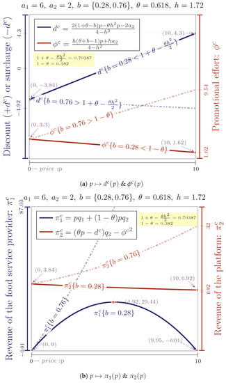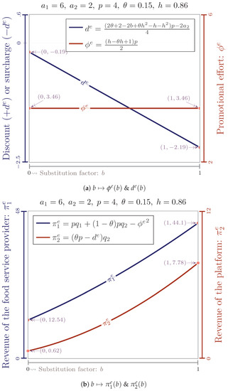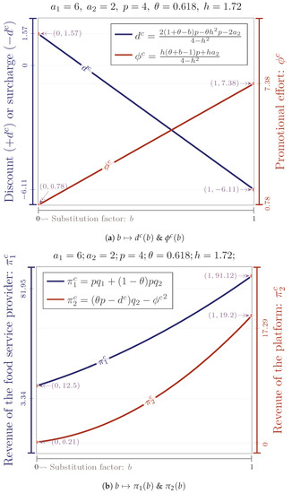 When the substitution factor b is low enough (), the online sales are low. In the Bertrand model, the increment in the sale price p significantly leads to a decrement in the sale quantity. As shown in Figure 3a, the platform gives a higher discount to online customers to increase online sales. At the same time, the platform also decreases promotion to save promotional costs. Since the platform can adjust the real price online by adding a surcharge or giving a discount, it is less affected by price changes. The profit of offline sales will be affected by the price, and too-high or too-low prices will make the profit of offline sales low. As shown in Figure 3b, the profit of the food service provider first increases and then decreases in the sale price. The platform is different; the increment of the online discount attracts some offline customers to buy food online, so the platform’s profit is decreased in the sale price. When the substitution factor b is high enough (), the online sales are high. In the Bertrand model, the increment in the sale price p insignificantly leads to a decrement in the sale quantity. As shown in Figure 3a, the platform gives a higher surcharge to online customers to encourage more profit. At the same time, the platform also increases promotion efforts to attract more customers online and offline. Therefore, with the increases in both price and sales (including online and offline), both the profit of the food service provider and the profit of the platform are increasing.