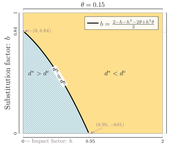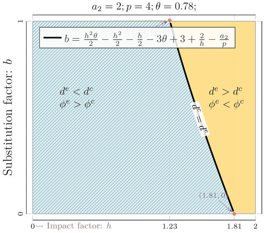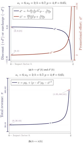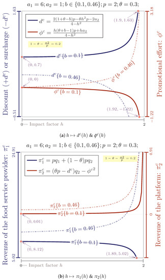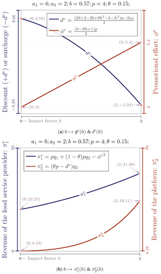 A high impact factor of promotion on online sales h makes the promotional effort significantly increase online sales. When the substitution factor is high (), online sales are large. When the impact factor of promotion increases, the platform should decrease the discount to encourage more profit. (See Figure 5a,b). The decrement of increases the platform’s unit revenue . Then, the platform should increase the optimal promotional effort to increase the platform’s profit. However, when the substitution factor is low (), online sales are small. When the impact factor of promotion increases, the platform should increase the discount to decrease the actual online price to attract more online customers. (See Figure 5a,b). Then, the platform should decrease the optimal promotional effort to save promotion costs. Then, as the impact factor of promotion increases, the platform increases its profit by increasing the online discount and decreasing promotional efforts. However, increasing the online discount and decreasing promotional efforts lead to a decrease in offline sales, which hurts the food service provider’s profit. Therefore, the food service provider’s profit decreases in the impact factor of online promotion.
