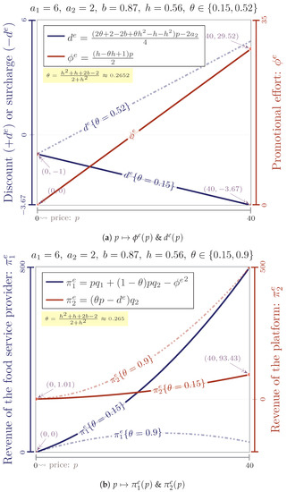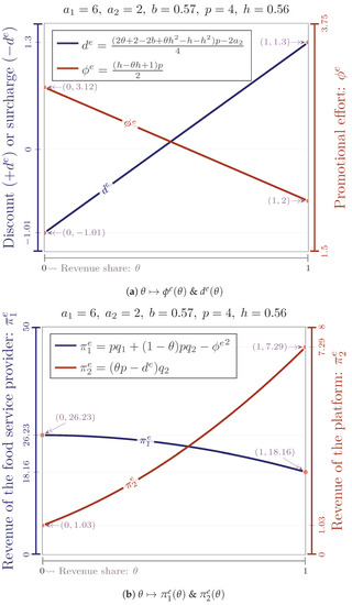 is the revenue share of the platform. As shown in Figure 8a, the decrement in the food service provider’s revenue share always makes the platform less motivated to promote the product. As the revenue share of the platform increases, the unit profit of the food for the platform is increased, so a higher discount should be provided such that the actual price for online customers is decreased to increase online sales. Therefore, the platform’s profit is obviously increasing. However, since the revenue share of the food service provider is decreased, and the offline sales are decreased due to the decrement of the actual price for online customers, the food service provider’s profit is decreased.