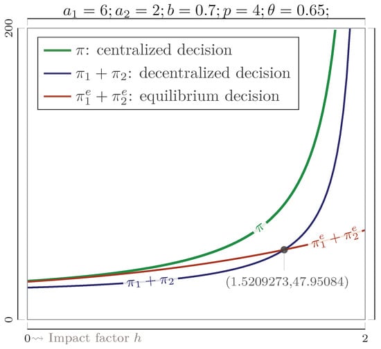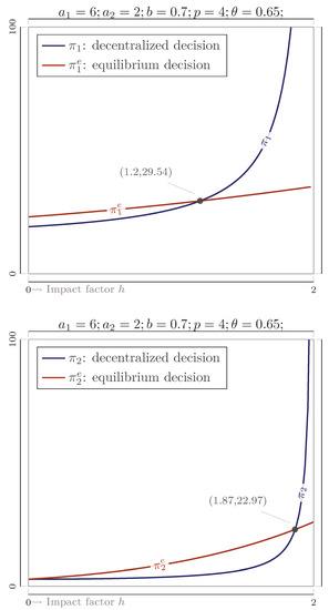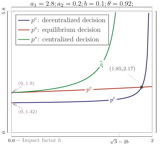 Next, we compare the prices among three scenarios. Furthermore, we analyzed the effect of the impact factor of promotional on online sales h on optimal pricing under three decision scenarios. As shown in Figure 19, under all three scenarios, the optimal price increases with h. Because of the competition between online and offline sales under the decentralized decision and the equilibrium decision models, the decentralized optimal price and the equilibrium price are always lower than the centralized optimal price. The increment of h leads to a higher promotional effort, and the higher promotional effort leads to a higher retail price. In addition, because the food service provider’s revenue is from online and offline sales but the platform’s revenue is only from online, the impact of the promotional effort on the service provider’s sales is more sensitive than on the platform’s sales. Since the platform decides on the promotional effort under equilibrium but the food service provider decides on the promotional effort under the decentralized decision model, the impact of h on the retail price is more sensitive under the decentralized decision model than under the equilibrium decision model. Then, as h increases, the price comparison result between the decentralized decision and the equilibrium decision models is different. In particular, there exists a threshold within the two decentralized models. When h is less than the threshold, the equilibrium price is higher than the decentralized price. However, when h is higher than the threshold, the equilibrium price is lower than the decentralized price. (See Figure 19).