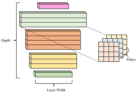 Scaling is a widely used technique to achieve better accuracy and numerous methods have been utilized to scale networks. Upscaling depth is the most prevalent method, although scaling models by image resolution is also becoming increasingly popular. Figure 1 represents the depth and width of a network. EfficientNet [15] was created by compound scaling MobileNets [14,16] and ResNet [9] networks, i.e., scaling the network width, depth, and resolution by fixed coefficients. Network width refers to the number of filter banks in any layer of a network, depth refers to the number of layers in a network, and the resolution represents the number of pixels in the input image [15]. Scaling is the increasing or decreasing of any of these factors, resulting in a change in size and accuracy. Upscaling, however, could result in the configurations of the upscaled networks being ill-suited to their tasks because hand-crafting networks lead to human errors and consequent inaccuracies, resulting in an inefficient network. Filter pruning has long been considered a good alternative to accelerate deep neural networks, but this does not solve the core inefficiencies in the construction of the network. In other words, the accuracy gain diminishes as networks get larger because all parameters in a network have different sensitivity to its accuracy.