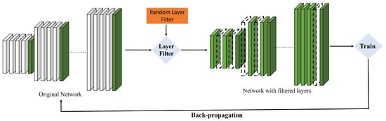 where represents each layer with channel and kernel sizes. N is the total number of layers, with each group of a layer consisting of layers. Using the weights , the new collection of layers is derived into a pseudo network , which is a parameterized subset of the layers in , i.e., . During each epoch of the training stage, random layers and filters are chosen to be trained which omits certain layers and filters from , as shown in Figure 2. is trained and its cross-entropy loss is computed as follows:
