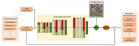 The best DEV after depth evolution is used to build a recalibrated network for width evolution, as explained in Algorithm 1. The recalibrated network is then used to compute rewards for the networks derived from it using the width encoding vectors (WEVs). Unlike DEVs, each WEV is injectively mapped to a network of specific depth and layers of out-channels, i.e., the networks created by every WEV are unique to each element in it and also to the DEV it is evolved from. As shown in Figure 3, 50 WEVs are built from the recalibrated network, and their rewards are computed. Each gene of a chromosome, represented by the WEV, is encoded with the ratio of channels of each layer compared to the original. The individual genes chosen do not matter, as this evolution is used to resolve the size of the final network, not the specific configuration. The size of each chromosome is dependent on the size of the recalibrated network. At every step before evolution, random chromosomes are used to generate sub-networks for the recalibrated network, and their reward is computed agnostic to the training dataset. The chromosomes with the highest rewards are mutated and crossed over, and the subsequent chromosome pool is created by selecting the best chromosomes from a pool of the parents and their offspring.