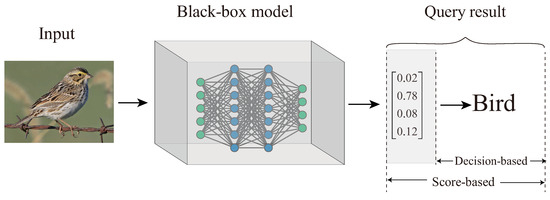 In terms of the adversary’s goal, adversarial attacks can be classified into untargeted and targeted attacks. In an untargeted attack, the classification model is misled into predicting any incorrect class, whereas in a targeted attack the threat model is misguided by producing a chosen (target) class. Based on the knowledge that an attacker has about the target model, adversarial attacks can be generally divided into two primary types, namely, white-box attacks and black-box attacks. In the white-box setting, an adversary has complete access to the victim model, including its structure and parameters, and can easily exploit various gradient-based methods to craft adversarial samples [8,9,10,11]. However, white-box attacks are not practical in real-world applications, as model-specific information may not be exposed to users. As such, the focus is shifting towards black-box adversarial attacks, where the adversary is restricted to only acquiring the input–output correspondences of the target model and has no access to the threat model. Current existing black-box attacks can be categorized into transfer-based and query-based methods according to whether the attacker needs to query the target model. Transfer-based methods [12,13] can launch a black-box attack without model queries, which leverages the transferability of adversarial examples, i.e., an adversarial example generated by one visual model may fool other neural networks with different architectures trained on the same task. In consequence, the consistency between the victim model and the surrogate model is crucial, and greatly influences the attack success rate. Based on the information received from queries, the query-based approaches can be broadly divided into score-based attacks (known as soft-label attacks) and decision-based attacks (known as hard-label attacks), as shown in Figure 1. As far as score-based attacks are concerned, the adversary has access to the prediction probabilities (e.g., soft-label output) of the target model, and can estimate the gradients by adopting zeroth-order optimization techniques to craft adversarial examples [14,15,16,17]. On the other hand, the decision-based setting only provides prediction labels (e.g., hard-label output) of the model, and does not even provide any prediction probabilities [18,19]. Due to less information being exposed from the query feedback, gradient estimation in decision-based attacks is very inefficient and impractical.