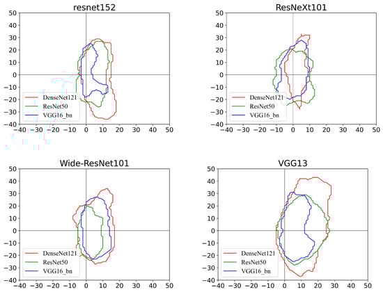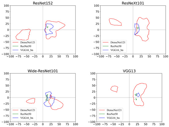 In this section, we explore the geometric properties of the classification model along the adversarial directions from different reference models. Specifically, we study the decision boundary of three victim models, DenseNet121 [33], ResNet50 [34], and VGG16_bn [35], in the planes spanned by the adversarial directions from ResNet152 [36], ResNeXt101 [37], Wide ResNet101 [38], and VGG13 [35], respectively. These seven models are all state-of-the-art models that were pretrained on the ImageNet [39] dataset, with the three victim models commonly chosen by prior works [22,24] and the other four victim models selected randomly from the torchvision package. For brevity, we denote the four surrogate models as , respectively. We randomly select an image from the ILSVRC2012 verification set, originally classified as ‘brambling’, and use it as an example to study the decision boundary.