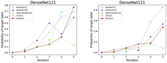 We now develop the above ideas into a query-efficient iterative attack algorithm, which we name ADDA. One iteration of the algorithm consists of three components. For brevity, we denote a set of candidate models as . First, a candidate model is randomly chosen from as a substitute model. Second, an adversarial direction is obtained by Equation (7) using the candidate model. Following this adversarial direction can generate a candidate seed via Equation (6). Third, the query function (Equation (4) for an untargeted attack and Equation (8) for a targeted attack) is used to judge whether the candidate seed is an adversarial example. If the value of the query function is equal to 1, the candidate seed is considered as an adversarial example and the adversarial attack is successful. Otherwise, the candidate seed is used as the starting point for the next iteration. The termination condition of the whole iterative process is when the adversarial example is successfully found or the query budget runs out. The complete procedure is shown in Algorithm 1. In addition, Figure 5 intuitively shows the process of targeted ADDA for the norm. From the picture, it can be observed that even when using different random seeds, the ADDA algorithm can find the adversarial examples successfully after five iterations.