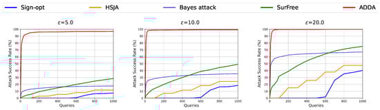 First, we compared our proposed ADDA with Sign-opt, HSJA, and Bayes attack, which are the current state-of-the-art decision-based attacks for the threat model. We set the perturbation bound to and the step size of ADDA in PGD to . Table 1 presents the performance comparison of untargeted attacks on ImageNet. It can be observed that ADDA enjoys significantly higher efficiency in terms of the average number of queries and attack success rate than Sign-opt, HSJA, and Bayes attack. Specifically, ADDA consistently achieves an attack success rate close to while requiring to fewer queries compared to the competitors across the three different victim models.