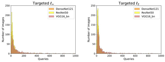 For each example in the targeted attacks, a random class other than the true one was chosen as the target class out of 1000 classes. Notably, we set the maximum perturbation size as in the targeted case, which has been used in several previous papers [23,30]. The step size in PGD and the perturbation bound under the perturbation constraint were the same as those in the untargeted setting. Due to the relatively larger dimensions of the images in ImageNet, previous methods have encountered difficulty when exploring them in targeted attacks, whereas our approach overcomes such problems. The experimental results are reported in Table 3 and Figure 7. The results in Table 3 show that ADDA achieves a high attack success rate while maintaining low query consumption. Regardless of the or setting, the performance of our approach on the DenseNet121 and ResNet50 classifiers is better than that of VGG16_bn in targeted attacks. In Figure 7, we plot the histogram of the number of model queries required for a successful targeted attack made by ADDA over three different victim models. Note that the query distributions are highly left-skewed, indicating that only a few images demanded a large number of queries, while most images required only about 100 or fewer model queries to construct adversarial examples.
