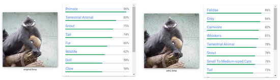 Demonstration of Google Cloud Vision labeling of the original image and the adversarial image after 2 queries with constrained perturbation with . Interestingly, our adversarial image is classified as “Felidae”.