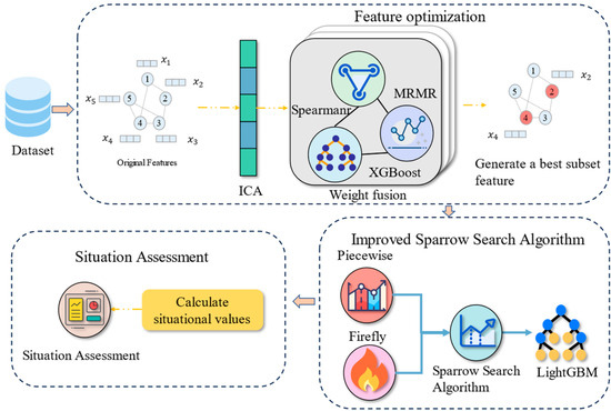 LightGBM [14], an efficient algorithm for handling large-scale data and high-dimensional features, uses a histogram-based decision tree approach to accelerate the training process and prediction of models with good scalability. In the IoT network security situation assessment field, LightGBM demonstrates efficiency, scalability, and robustness, which can significantly improve the accuracy of IoT network security situation assessments. Therefore, to enhance the situation assessment accuracy, this study introduces a new scheme based on feature optimization and improved SSA-LightGBM. The key contributions of this paper are summarized as follows: