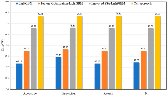 To assess the influence of feature optimization and the improved SSA-LightGBM algorithm on the proposed model’s performance, an ablation experimental analysis was conducted. The traditional LightGBM, the feature-optimized LightGBM, the improved SSA-LightGBM, and the method proposed in this study were compared to explore the individual contributions of different algorithms to the overall model performance. The results are depicted in Figure 3.