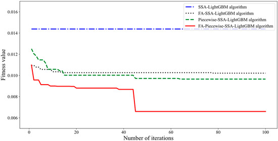 To validate the performance of the proposed improved SSA algorithm, individual fitness values were used as a measure, where the fitness function was defined as the difference between one and the accuracy. Therefore, smaller fitness values represent better individuals, and the change in the fitness function reflects the convergence of the assessed model. Figure 4 compares the convergence of the SSA-LightGBM, FA-SSA-LightGBM, Piecewise-SSA-LightGBM, and FA-Piecewise-SSA-LightGBM evaluation models.
