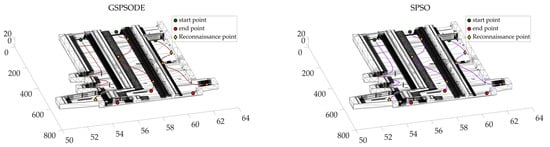 In each comparison, all algorithms are run 10 times to find the mean and standard deviation values. The optimum, mean, and standard deviation values of the fitness obtained by the six algorithms for path planning in three scenarios with different levels of complexity are shown in Table 3. The GSPSODE algorithm shows the best performance in every scenario; optimal fitness values are obtained, and the convergence stability standard deviation value is the smallest, which is because GSPSODE effectively improves the effects of some particles being far from the local optimum and the bad overall convergence of the algorithm. The optimal fitness values of the six algorithms are also affected by the pipe corridors’ complexity. For example, Scene 2 has few obstacles, and the regular pipe corridor grid model makes the inspection points easy to recognize, so the smallest fitness values are obtained through iteration. However, many obstacles are set in Scene 3, and the inspection points are all located in narrow places, making path planning more complex. Hence, the fitness values of the planned inspection path are larger.