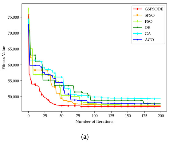 Figure 8 shows the fitness value iterations of the six algorithms in three scenarios, and the fitness values of each algorithm during the iterations are helpful for further comparative analysis. As can be seen, all algorithms converge well, with slight differences in their minimum fitness values, and GSPSODE can obtain the optimal solution first, and the fitness values of GSPSODE in the three scenarios are lower than those of the other five algorithms, followed by SPSO. In Figure 8a, GSPSODE and ACO converge rapidly early on and converge to an optimal value of about 50 iterations. The comparison with the final results shows that GSPSODE has the highest accuracy, followed by ACO. It is also found that GSPSODE converges to the optimal value very quickly at the beginning of the iteration, which proves that the proposed search strategy can accelerate the convergence speed and improve the convergence accuracy. In Figure 8b, GSPSODE performs better than other algorithms and rapidly converges to the optimal value. As can be seen in Figure 8c, DE outperforms both GSPSODE and SPSO at the beginning of the iteration. However, as the iteration begins, GSPSODE and SPSO rapidly converge to a minimum value.