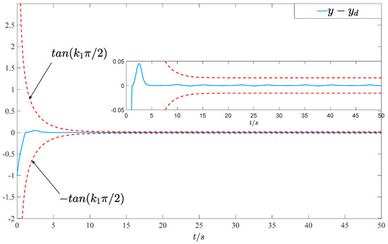 When the initial condition of the system changes, the parameters of the controller based on the barrier function need to be adjusted [25,26,27]. However, it may be difficult and impossible to obtain the initial conditions of the system sometimes. Therefore, we chose Equation (4) for error transformation without additional conditions, which indicates that the initial conditions of the system can be arbitrary. Moreover, the reason why we chose transformation (4) is that is the inverse of the barrier function we used.