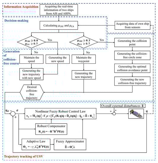 As shown in Figure 1, the intelligent fuzzy control system, which integrates a fuzzy collision evaluator, a fuzzy collision avoidance acting timing indicator, a collision-free trajectory generator, and a nonlinear adaptive fuzzy robust control law, is illustrated. The procedure of this proposed control system, which can make decisions by obeying the COLREGs and precisely guide USVs to track arbitrary collision-free desired trajectories, can be summarized with the following four phases:
