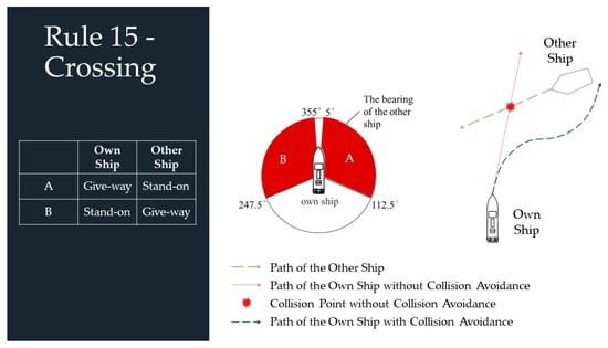 Collision avoidance strategy for a two-ship crossing situation based on rule 15 of the COLREGs.
