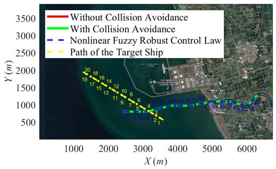 One collision avoidance scenario was simulated in Yongxin Fish Harbor of Kaohsiung City, Taiwan, for the validation of the collision avoidance performance of this proposed control system under the influences of ocean disturbances and modeling uncertainties. The modeling uncertainties of the controlled USV were considered 10% of the nominal values of the system parameters in Table 1, and the ocean environmental disturbance was created by referring to the published paper []. To verify the collision avoidance performance of the proposed control system, a crossing situation was arranged in this scenario. As displayed in Figure 6 and according to rule 15 of the COLREGs, the controlled USV was a give-way ship, and the target ship was a stand-on ship for this crossing situation. Following rule 15, it was suggested that the stand-on ship sail straight forward, and the give-way ship perform a give-way action along a collision-free trajectory.