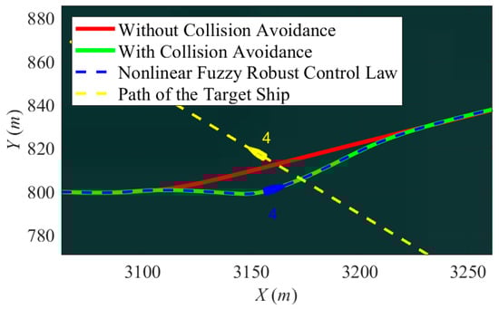 The enlarged figure around point 4 of Figure 8 details the relative actions taken by the target ship and the controlled USV.
