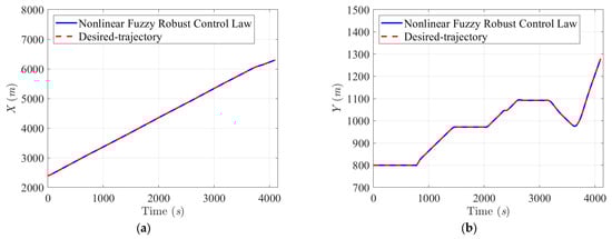 From the trajectory tracking error histories in the X-axis (a) and Y-axis (b) and the tracking error history of the heading angle ψ, we can determine that the mean square errors in positions () and in the heading angle () under the influences of 10% modeling uncertainties and random environmental disturbances are and , respectively.