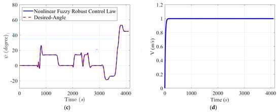 This figure shows that a collision will occur at point 4 if the controlled USV sails along the original predefined trajectory (red line). To avoid this unexpected collision situation, a decision was made by the proposed control system: “the proposed control system rearranges a collision-free trajectory (blue line) once a ship-ship collision is estimated by the proposed fuzzy collision risk evaluator, and the fuzzy robust control law then robustly guide the USV to precisely follow the collision-free trajectory under influences of modelling uncertainties and ocean environmental disturbances”. Figure 9a–c and Figure 10a–c show that the proposed fuzzy robust control law has very promising robustness in terms of modeling uncertainties and ocean disturbances and can guide the USV to precisely follow the collision-free trajectory not only in position but also in attitude. Figure 9d indicates the sailing velocity, and it was well-maintained at 1 m/s by the trajectory generator.