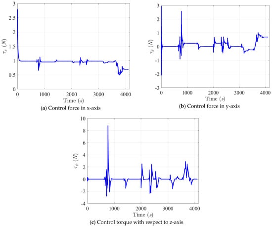Histories of the control commands, including the forces τx, τy, and the torque τψ with respect to Scenario 1.