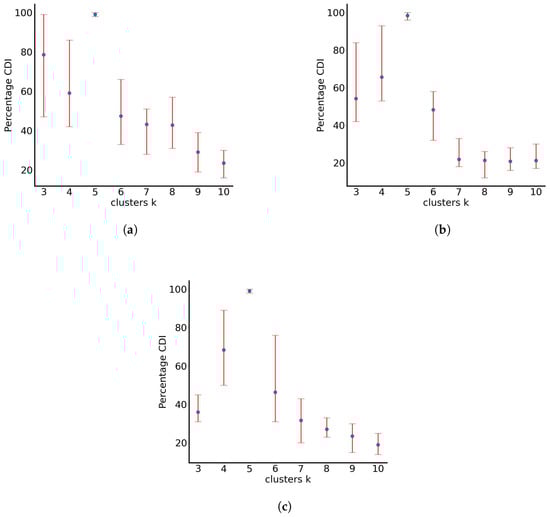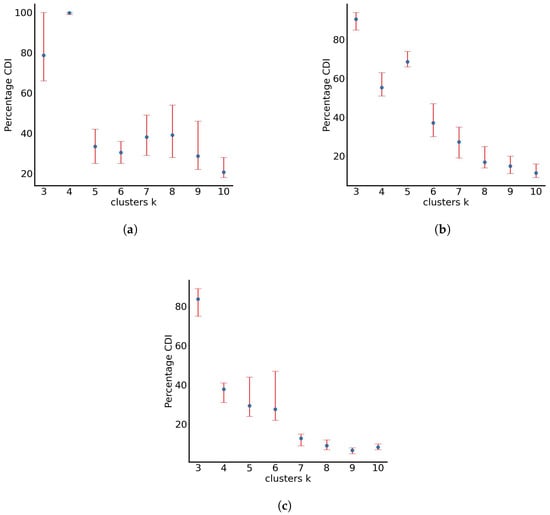 RUN-ICON is utilised on the normalised data sets of the final particle positions. In Figure 2, the results of clustering using the RUN-ICON algorithm are presented, where the highest average CDI (defined in [40]) and its upper and lower bounds (which define Uncertainty, as defined in [40]) are presented for clustering the data from 3 to 10 clusters. We consider clustering from three clusters and above, as discussed in [40]. The optimal clustering and the respective average highest CDI and uncertainty for all three test cases are presented in Table 1. From the presented results, it becomes clear that clustering the particles initially in four groups ((a), when they have not travelled far from the origin) and then in three groups ((b) and (c), when they travel further away) is optimal. The difference between the highest and the second-best CDI for all three cases ranges up to almost 50%, with the respective uncertainties (for the second-best CDI) being quite high (up to almost 0.4).