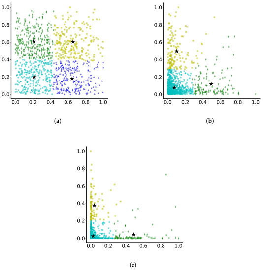 Then, based on the final position of particles (after 10-time units), the clustering is presented on the normalised data sets in Figure 3. As observed, for case (a), the particles are separated into four, almost square, clusters. The algorithm, when particles have not travelled far from the origin, manages to detect particles that are concentrated around the origin, particles that have travelled away from the origin in both positive x and y directions, particles that travel away from the origin only along the positive x direction and particles travelling away from the origin only along the positive y direction. Then for cases (b) and (c), it seems that separation in 3 clusters is optimal, where some particles have travelled along the positive x axis away from the origin, some others have travelled along the positive y axis away from the origin, and a third group have not managed to travel far and have remained concentrated around the origin. As the results show, the more the range of variation for parameters c and d increases, the more distinct the separation in three groups becomes.