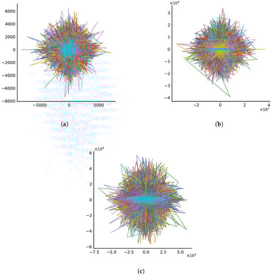 Further, noise is applied directly to the solution in the form of where t is the current time and is a normal distribution with mean equal to zero and standard deviation equal to . The experiment is repeated with varying randomly between 0 and 0.1, 0 and 0.5 and 0 and 1.0. It was observed that in all previous experiments, the noise term seemed to dominate, and all performed experiments (nine in total, considering the three ranges within which parameters c and d were allowed to vary randomly) displayed similar behaviour, except one, which will be discussed later. Thus, it was decided to examine with noise only the case with c’s and d’s varying randomly between (0, 0.1). The particle trajectories in the dimensionless x-y plane for each of the three experiments where the noise was applied to are shown in Figure 4.