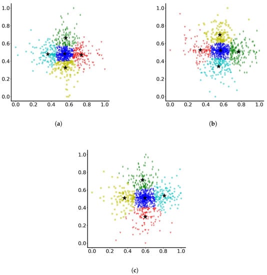 Dominant clustering of particles with parameters varying randomly between (a) 0 and 0.1, (b) 0 and 0.5 and (c) 0 and 1.0. The stars indicate the cluster centres. Different colours indicate different clusters.