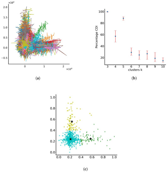 Clustering of particles with parameters c and d varying randomly in the range (0, 1) and noise standard deviation varying randomly in the range (0, 0.1). (a) Particle trajectories in the dimensionless x-y plane. Each line represents the trajectory of a single particle. The colours assigned to the lines serve the purpose of discretising trajectories for individual particles. (b) RUN-ICON dominant clustering results. (c) Optimal clustering in 3 groups. The stars indicate the cluster centres. Different colours indicate different clusters.