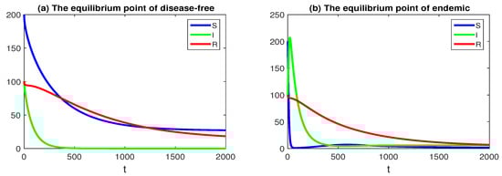 In model (1), let , , After the calculation, we obtain and . By observing Figure 1a, we can see that is locally asymptotically stable, which verifies the rationality of Theorem 2.