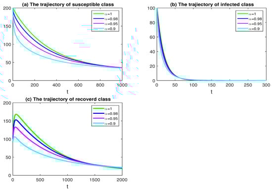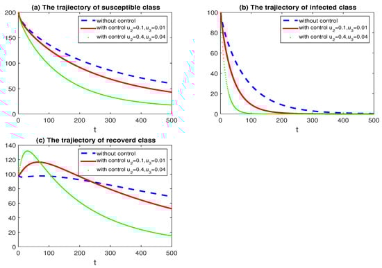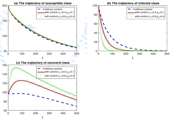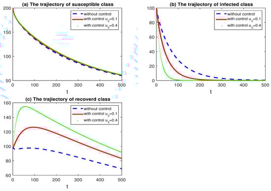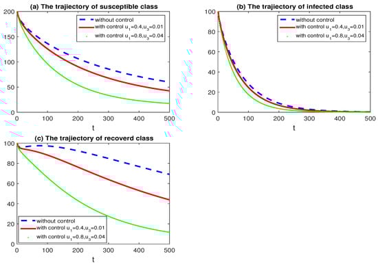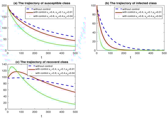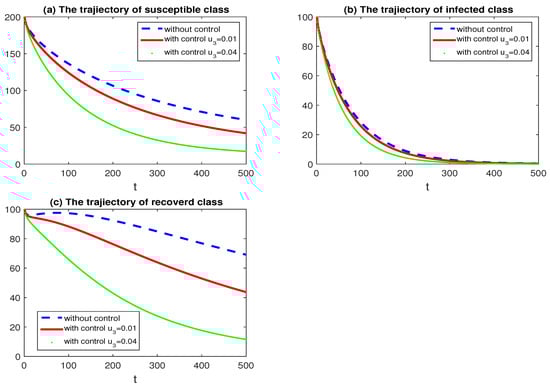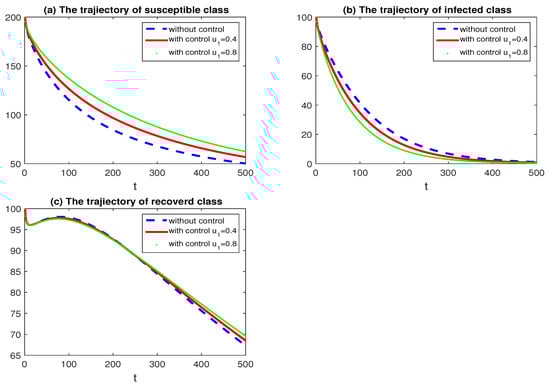 Figure 5 depicts the optimal control results of the fractional-order hepatitis B model using measures to vaccinate susceptible individuals by controlling variable . Figure 5a–c represent the dynamic behavior of susceptible, infected, and recovered persons under vaccination measures, respectively. From the observation of Figure 5, it can be seen that the greater the intensity of vaccination for susceptible persons (i.e., the greater the value of ), the faster the number of susceptible persons will decline, and the faster the number of infected persons will decline.