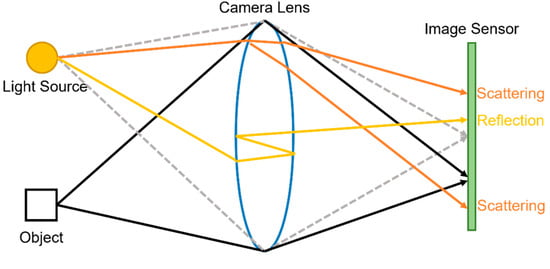 Figure 1 shows the generation process of a lens flare. To acquire a normal image, the light source and object must reach the image sensor through a correct path, as indicated by the figure’s dotted gray and black solid lines. However, unintentional reflection and scattering (indicated by orange and yellow solid lines in Figure 1) may occur by a light ray from a light source and damage or foreign substance in the front part of a lens. As shown in Figure 1, an artifact owing to a light source is overlaid on top of the existing scene as a layer, which generates a lens flare [9,10]. This significantly degrades semantic segmentation performance and can lead to inaccurate decisions in dangerous situations during autonomous driving.