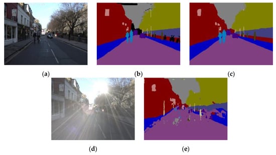 Figure 2 shows the effects of a lens flare on semantic segmentation, which is required for object detection during autonomous driving. Figure 2d shows an image damaged by a lens flare. When semantic segmentation by DeepLabV3+ [7] is performed using the image in Figure 2d, the error in the segmentation result worsens to the extent that objects are undetectable, as shown in Figure 2e. On comparing Figure 2c,e, which show the semantic segmentation results by DeepLabV3+ [7] of the original image, it was found that a lens flare is an obstacle in autonomous driving as it negatively affects the object detection system for autonomous driving.