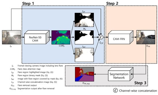 Figure 3 shows the overall architecture of the model proposed. In the first step, when a frontal-viewing camera image is input, CAM with the flare region highlighted is obtained using the weights of the ResNet-50 [32]-based binary classifier, which classifies the presence of lens flare. Furthermore, the ResNet-50 classifier uses images with and without flare as input during training, and the datasets having labels 1 and 0 are used for training. Then, we create three additional input images through CAM, which are applied with channel-wise concatenation and are input to the proposed CAM-FRN. The second step removes the flare from CAM-FRN based on the received images. Finally, the final segmentation map is predicted as the flare-free image is input to the segmentation network.