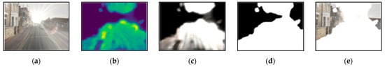 where the optimal threshold of 0.2 was experimentally determined for obtaining the highest accuracy of semantic segmentation using the training data. Lastly, Figure 4e shows an image created by covering the flare region with a mask using Figure 4d and Equation (4).