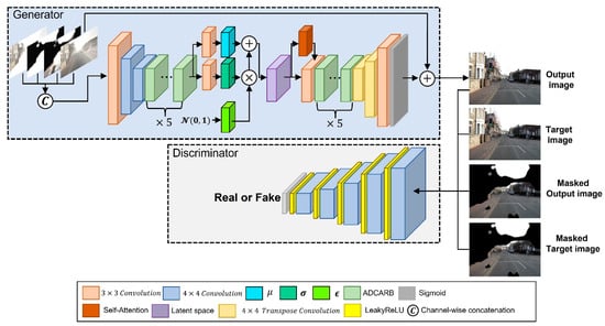 The latent space z obtained was sent to ADCARBs and decoder. Then, feature map resolution was increased to the input image size through transposed convolution, and the output image was generated through convolution layer and sigmoid layer at the end. The final output image was generated using summation of the generated image and the image damaged by lens flare through residual connection. The image generated accordingly entered the discriminator of PatchGAN [37]. We ensured that the image generated using a discriminator was similar to the ground truth and improved the quality of a flare removal image. Furthermore, Figure 4d was created using CAM and images utilizing were provided as an input of a discriminator. was multiplied as shown in Equations (7) and (8) below.