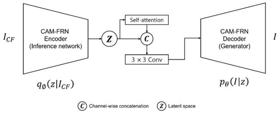Both the encoder of CAM-FRN, which was utilized as an inference network, and and , which are estimated for variational inference, used convolution layers. Although convolution layers can adequately extract local information of features using filters, it inadequately extracts global features (long-range dependency). To supplement this drawback, we applied the self-attention module proposed in [41] to our proposed method. We attempted to consider long-range dependency by applying self-attention to latent space which was sampled from . Two latent spaces were concatenated to fuse two features to simultaneously consider the latent space before applying self-attention and the latent space wherein long-range dependency was considered. The process described above is shown in Figure 7. We confirmed that the performance was improved when the fused latent space was utilized; the relevant experimental results are explained in Section of “Performance Comparisons According to Module Combinations Performance Comparisons According to Module Combinations”.