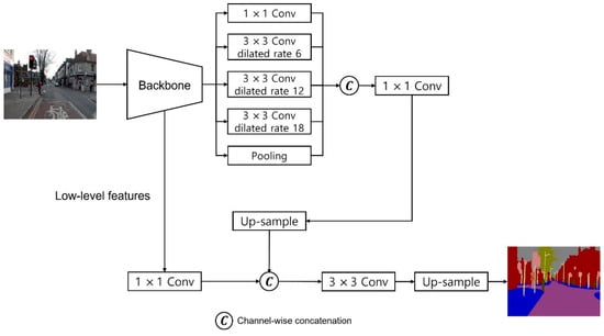 Several studies have been conducted [1,2,3,4,5,6,7] to overcome the shortcomings of existing handcrafted-based methods based on deep learning. SegNet [1] has a symmetrical encoder–decoder structure, where max pooling indices are delivered to the max pooling layer of the encoder and the upsampling layer of the corresponding decoder to preserve the information of the pixels lost during the max pooling process of the encoder. The results of previous segmentation models did not adequately distinguish the objects’ boundary; however, SegNet can accurately simulate the object boundary and is efficient in terms of memory and computational time during the inference process. However, relatively smaller objects such as streetlights, poles, road signs, and fences are not adequately detected. A pyramid scene parsing network (PSPNet) [2] was proposed to solve the problem of classifying incorrect semantic classes that are inappropriate for image situations considering previous segmentation methods did not consider the global context of input images. They applied various pooling operations to the feature maps extracted through a convolutional neural network (CNN) and connected them to obtain the segmentation prediction result. Various pooling operations enable the model to learn feature maps in different resolutions, and global contextual information can be considered when all information is combined. Classes appropriate for an image scene can be classified as global contextual information and verified. Image cascade network (ICNet) [3] provides detailed segmentation results with enhanced speed by extracting features from input images of various resolutions based on cascade feature fusion and cascade label guidance. Although the inference time and frames processed per second are improved compared with other models, accuracy is lower compared with state-of-the-art models. It is important to extract features from various receptive fields to detect different types of objects effectively. Therefore, various versions of DeepLab [4,5,6,7] proceeded with semantic segmentation using atrous convolution (dilated convolution). DeepLabV1 [4] used convolution of a fixed dilated rate; however, DeepLabV2 [5] introduced atrous spatial pyramid pooling (ASPP) where multi-scale feature information can be obtained from various receptive fields by combining features that have undergone different dilated rates. DeepLabV3 [6] uses an ASPP module that is enhanced from ASPP introduced in [5]. The difference is that spatial information loss is reduced significantly by applying different dilated rates according to the changes in the output stride. Segmentation is performed by capturing the information of multi-scale features and various objects in an image accordingly. The authors of [6] predicted segmentation results by applying a simple bilinear upsampling process to the features from the encoder in the decoder, which decreases the resolution of segmentation results, thereby preventing detailed information from being detected. As a solution, DeepLabV3+ [7] predicts the segmentation results by concatenating the feature maps of the interim stage and the last stage of the encoder and upscaling after learning.