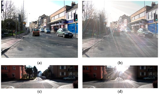 However, there is a limitation to removing a lens flare using deep learning methods. There is insufficient training data for supervised learning, and extensive amounts of time and effort are required to obtain a pair of images with and without a lens flare at the same location and time. When these image pairs are being acquired, the data acquisition process becomes complicated owing to certain conditions (e.g., the angle at which the light is radiated onto the camera lens front, location of the light source, etc.) that must be satisfied to generate a lens flare. Even when a pair of images with and without a lens flare is obtained from the same scene, the two images cannot be guaranteed to be captured under the same conditions. Therefore, we used a lens flare generation method proposed by Wu et al. [9] to solve the issue of insufficient training data by classifying lens flares into scattering and reflective cases. To obtain a scattering flare, scattering lens flare images were generated using the physics-based data generation method based on the physics of a lens flare. Conversely, a reflective flare was obtained directly through experiments because obtaining such type of data through a simulation is rather difficult. Therefore, they created a dataset for a single image flare removal (SIFR) task by synthesizing a lens flare with clean images without a flare. Data synthesis is conducted to create a lens flare removal dataset to be used for training, considering a lens flare, as shown in Figure 1, is overlaid on top of an existing scene. Accordingly, previous work [9] proposed synthesizing lens flare artifacts with images without a flare to generate the training data. Therefore, in this study, we used the method proposed in [9] to synthesize lens flare artifacts with CamVid [19] and KITTI [20] dataset inputs wherein a semantic segmentation label exists.