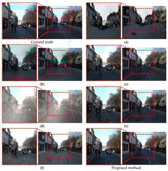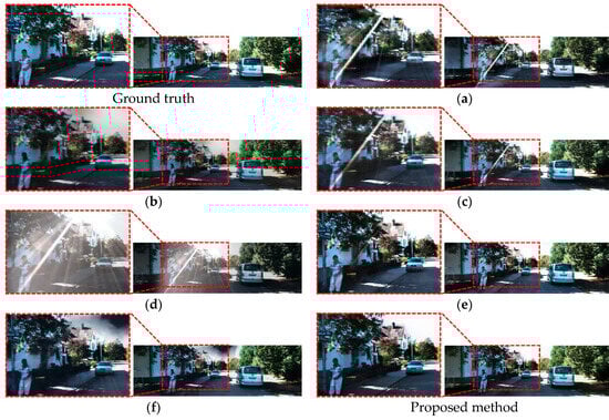 The cause of the result images in the first and second rows of Figure 19 and Figure 20 is the effect of lens flare on an image. Lens flare affects the contrast of an image, and a higher intensity of lens flare reduces the contrast. Therefore, lens flare in images (a) and (d) in Figure 19 and Figure 20 reduces their contrast, and the intensity of lens flare is high that the information of pixel values in the original image is severely lost. As the contrast value increases, dark areas become darker and bright areas become brighter, thereby creating a more evident contrast; however, the contrast between two areas becomes less in the opposite case. Because the contrast value is adjusted in proportion to the intensity of a pixel value, the loss of information of bright pixels before a lens flare increases as the contrast decreases. As a result, when lens flare is generated on objects with brighter pixel values, as shown in images (a) and (d) of Figure 19 and Figure 20, the pixel information in the original images (c) and (f) cannot be perfectly restored. However, in the third and fourth rows of Figure 19 and Figure 20, objects have relatively darker colors with low brightness or pixel intensity, and hence, lens flare is removed while retaining their colors to a certain extent. These limitations can adversely affect semantic segmentation, which is a pixel-wise classification task. Therefore, there is a need for research on methods for retaining the color and contrast of an image while removing lens flare.