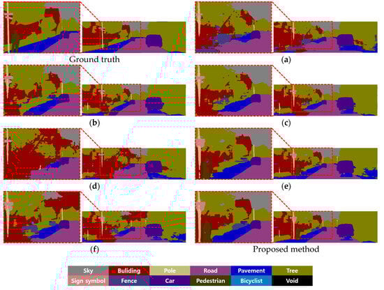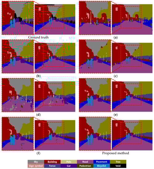 Comparison of previous methods and the proposed methods on semantic segmentation with frontal viewing camera images of vehicle.