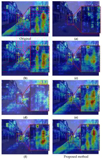 Figure 15 shows the results of extracting Grad-CAM for the bicyclist class when the original CamVid image was input in DeepLabV3+ [7], and when Grad-CAM [51] for the bicyclist class and the images restored by CAM-FRN and other methods were input in DeepLabV3+. And Figure 16 shows the results of extracting Grad-CAM for the pedestrian class when the original KITTI image is input in DeepLabV3+ [7], and when Grad-CAM [51] for the pedestrian class and the images restored by CAM-FRN and other methods are input in DeepLabV3+. After analyzing each figure, we found that our proposed method is the closest to the original image’s Grad-CAM.