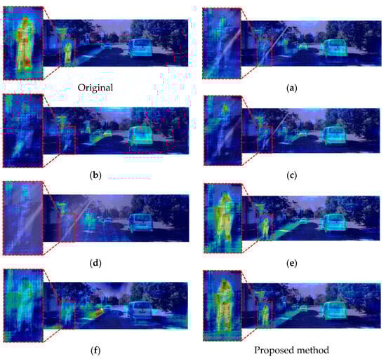 This figure shows the Grad-CAM for the pedestrian class when segmentation is performed using the restoration results according to the input combination in the syn-flare KITTI dataset: (a) the method of Qiao et al.; (b) the method of Wu et al.; (c) Pix2Pix which is one of image-to-image translation methods; (d) CycleGAN; (e) FFANet which is proposed for dehazing; and (f) MPRNet which is proposed for deraining. The last image is the case of our proposed method.