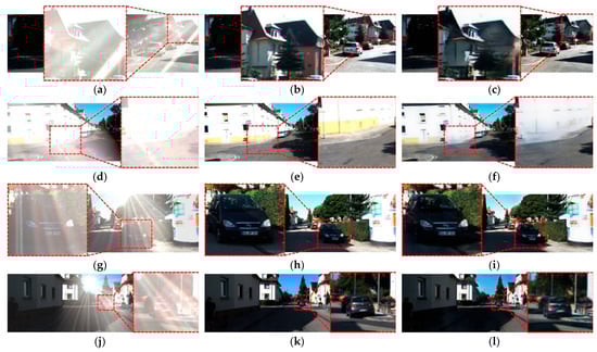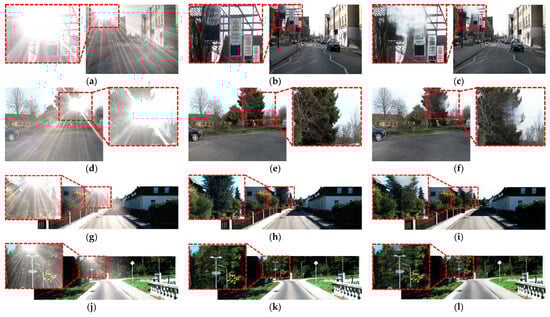 Successful and unsuccessful restoration cases of CAM-FRN in the syn-flare KITTI dataset. Images of unsuccessful restoration: (a,d) input images, (b,e) ground-truth images, and (c,f) prediction images. Images of successful restoration: (g,j) input images, (h,k) ground-truth images, and (i,l) prediction images.